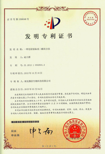 熱烈祝賀湖北微控生物科技有限公司2015年3月4日獲得“一種連續(xù)制備戊二醛的方法”發(fā)明專利證書。專利號(hào):2L2012 1 0552531.2
